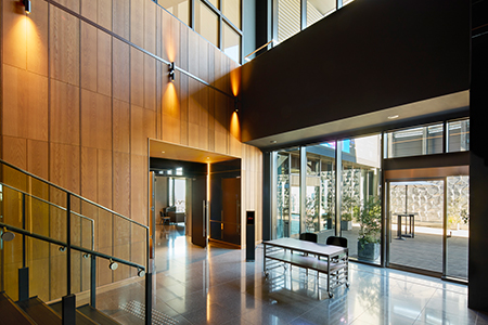 天井高9.9mの吹き抜けに広がる升目状のLEDライン照明が印象的なファンクションルーム。