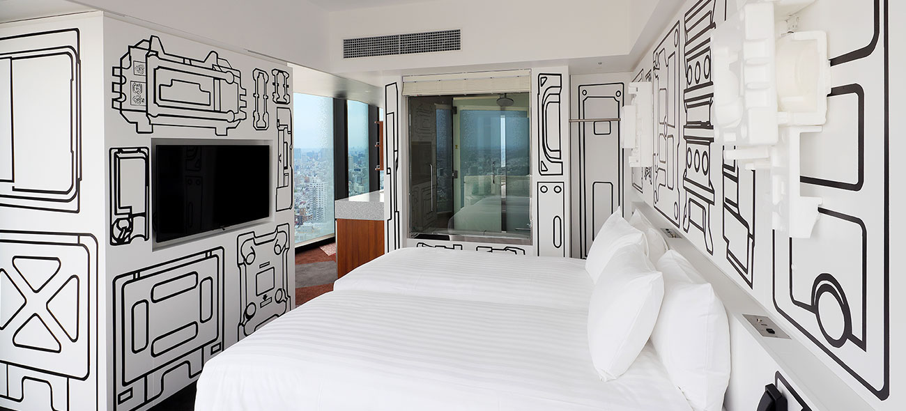 The guest room is inspired by one of Kaihatsu's most renowned works, Styrofoam, which utilizes actual Styrofoam that is often discarded as garbage. Kaihatsu utilises Styrofoam from temporary enclosures at the site, creating a permanent art installation that evokes "memories of the site." Kaihatsu personally painted all of the Styrofoam pictures on the walls, and lighting fixtures made from real Styrofoam provide a beautiful display of light filtering through the material, where you can experience its beauty first-hand.