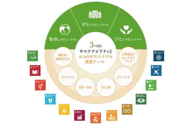 As our sustainability policy, we have established three sustainability goals (visions we aspire to be) - an "Earth-friendly hotel, a city-friendly hotel, and a people-friendly hotel" - and six key sustainability themes (themes that we will focus on among social issues). With a deep awareness of the SDGs (Sustainable Development Goals), we will contribute to the realization of a "sustainable society" through our hotel business.